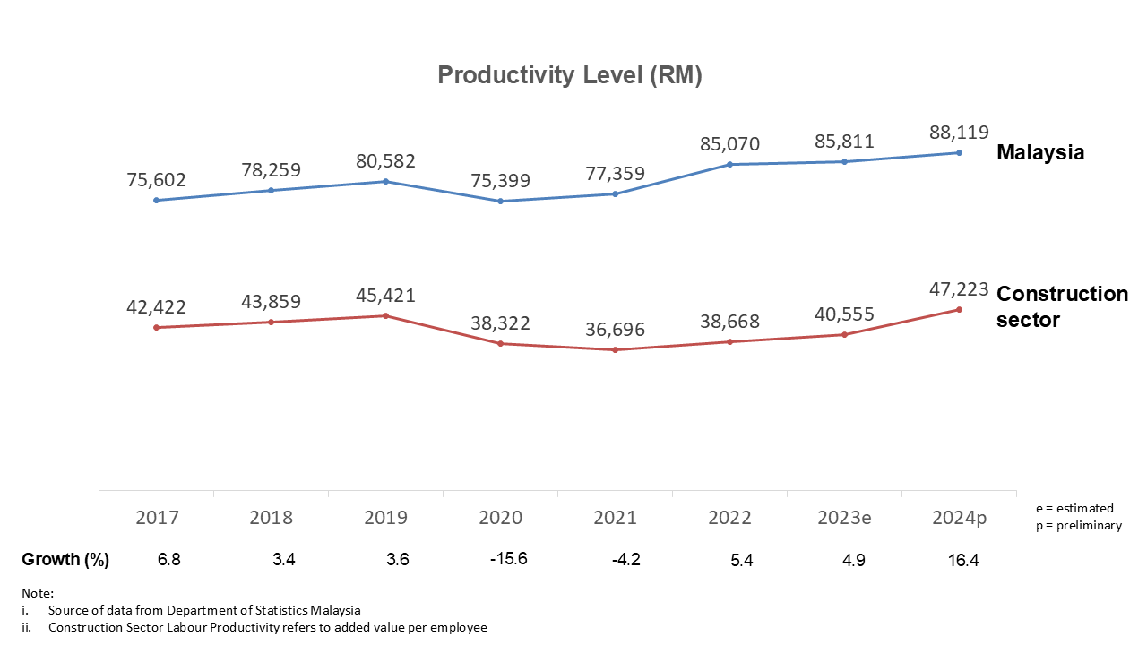 Under the Twelfth Malaysia Plan (12MP), productivity of the construction sector is expected to grow at an average rate of 3.8% per annum to RM46,200 supported by the increased adoption of modern construction technology and methods. In return, this will contribute 4.2% to the construction sector output growth.