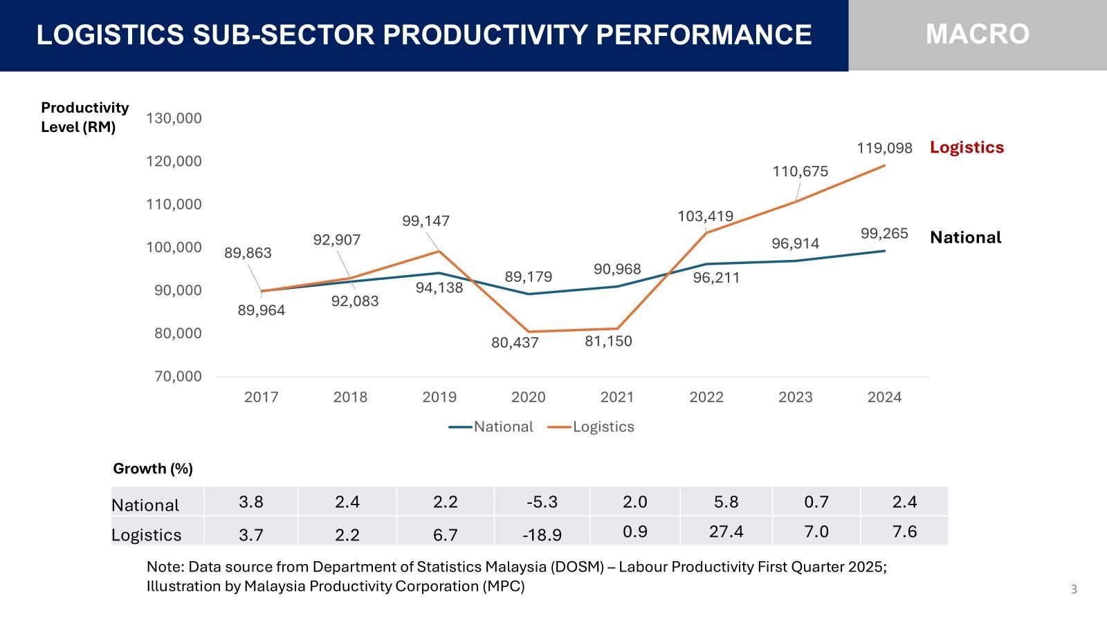 While both national and logistics productivity experienced declines in 2020 due to the COVID-19 pandemic, logistics faced a deeper contraction of 18.9 percent as global supply chains were disrupted and operational capacity was restricted. However, the sector rebounded sharply in 2022 with a remarkable 27.4 percent growth, driven by accelerated digitalisation, e-commerce expansion and strengthened trade activity.