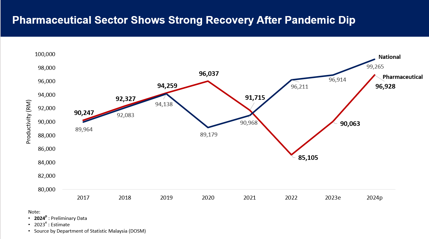 In comparison, national productivity showed a steadier recovery curve, rising from RM89,179 in 2020 to RM96,211 in 2022 and continuing upward to a projected RM99,265 in 2024. While the pharmaceutical sector experienced deeper volatility, its rapid rebound underscores strong industry resilience and renewed growth capacity.